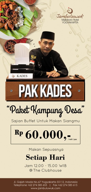Buffet Pak Kades (Paket Kampung Desa) dibuka setiap hari mulai pukul 12:00 WIB sampai dengan pukul 15:00 wib. Masakan dengan menu tradisional ini kami jual hanya dengan harga Rp 60.000,nett/ Pax all you can eat. Menu yang kami sajikan di Buffet Pak Kades (Paket Kampung Desa) antara lain: Sayur Lodeh, Sayur Daun Singkong, Nasi Goreng Pete, Perkedel Singkong, Ayam Goreng Kampung, Aneka Sambal, Aneka Kerupuk, Aneka Jajan Pasar dan masih banyak pilihan menu lainnya.